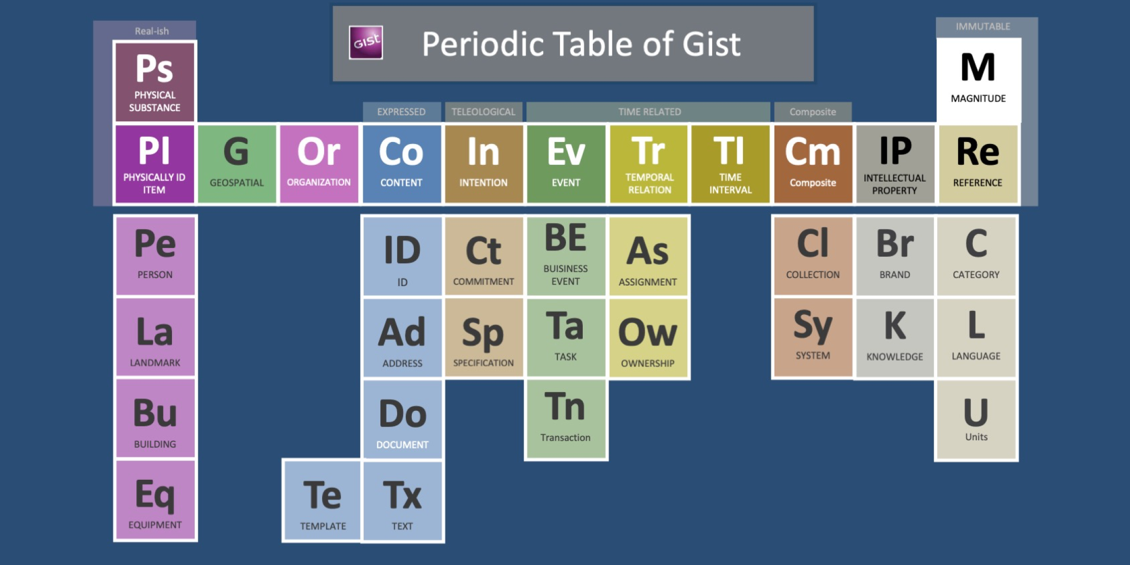 gist is an upper-level ontology containing a minimal set of concepts required for most business applications. It has been developed and maintained by Semantic Arts since 2012.