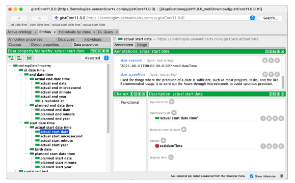 A clever ontological detail not shown here: A temporal relation such as “Mark supervises Emma” must be gist:isConnectedTo a minimum of two objects — this cardinality is defined in the GIST ontology itself and is thus inherited. The result is data integrity managed by the semantic database itself! Additionally, you can see the richness of the GIST “at date time” data properties most clearly in the expression of the hierarchical model in latest v11 ontology (see Protégé screenshot below). This allows the modeler to specify the precision of the start and end date times as well as distinguishing something that is “planned” vs. “actual”.
